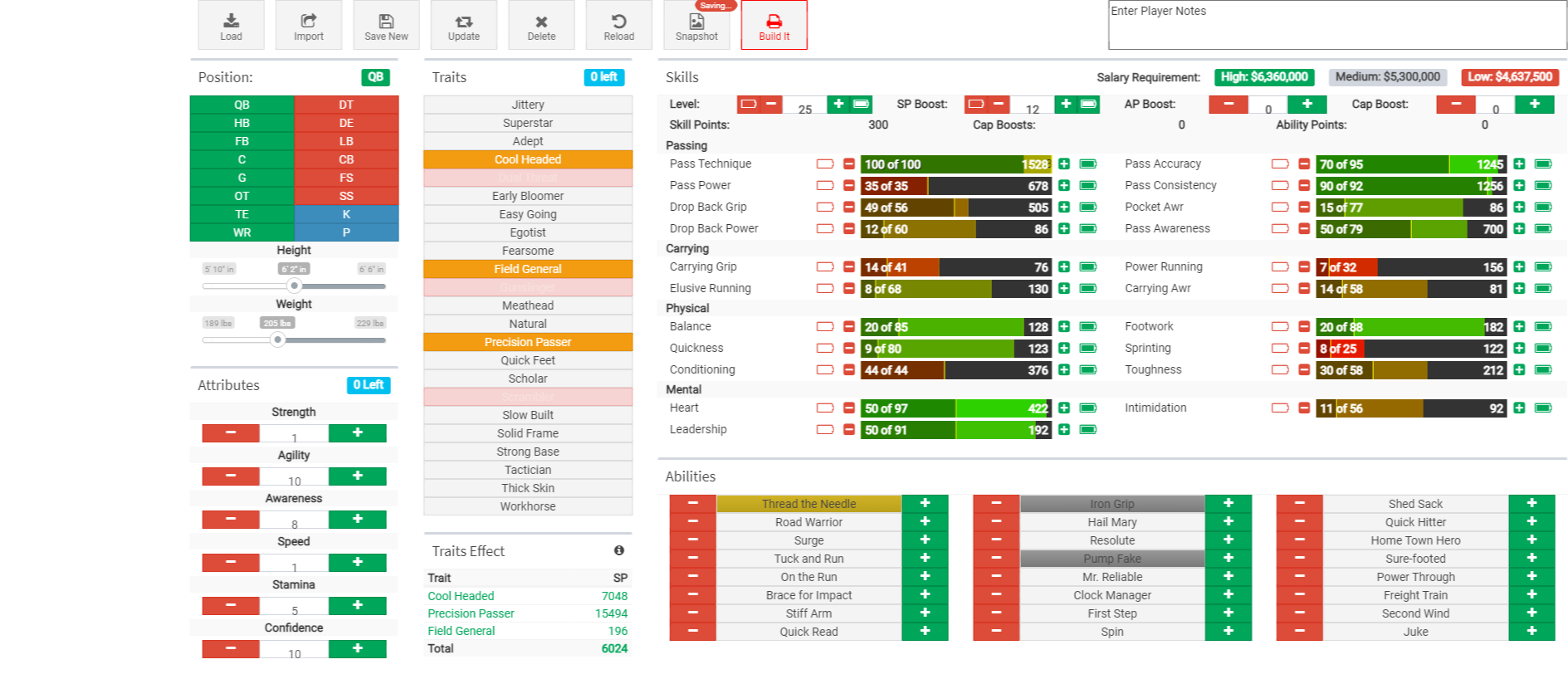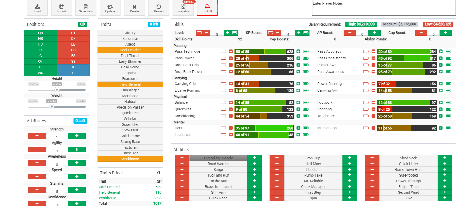 My goal is to create a thread for each position in this tab so we can share and compare builds. I will start with my QB build. I prefer pocket passers. Before I post my build with some comments I want to give Xar's credit for sharing his QB build with me. I combined our builds to create this build...