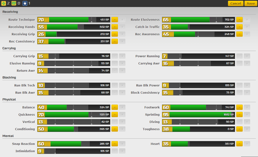 Check out the WR I just built, look at the caps and attributes, if non superstar I wouldn't bother aiming for 100 speed due to the above reasoning so you don't really want to bother getting the cap to 100 if you aren't going to invest to 100.