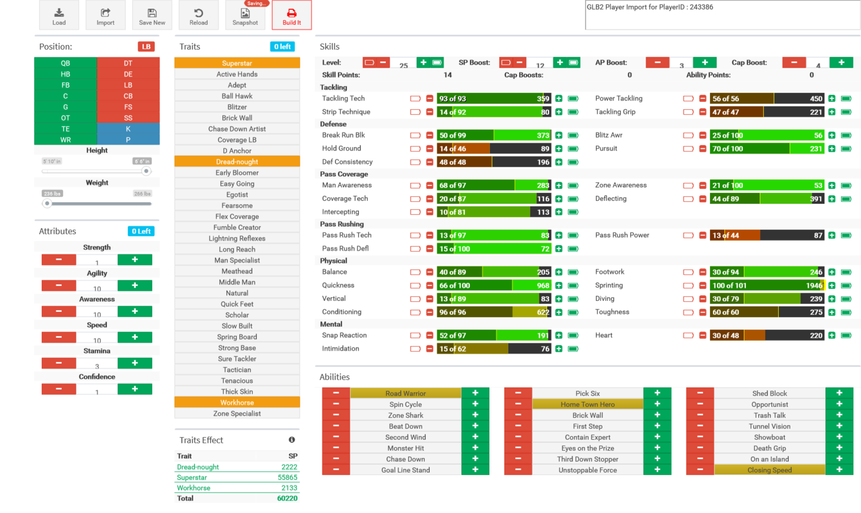 I think a respec would get 5-6 points back, i wouldn't go full conditioning, he won't do much good on the field, 100 sprinting is good but 4 points would be way more usefull elsewhere, 93 tackling tech won't matter much with this PT and grip. And i like BRB on LBs.