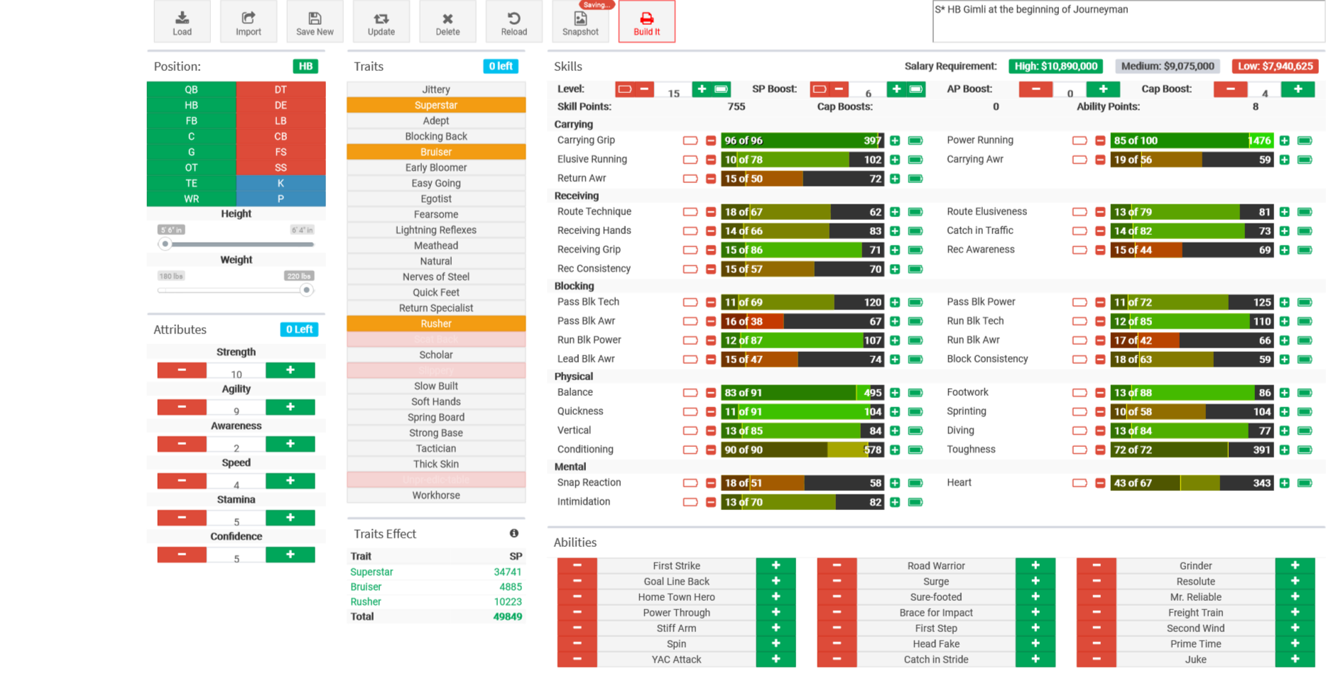 People typically complain that Power HBs don't scale up well, but I disagree. If you want a Power HB at Soph, build a Power HB. Too often people add Sprinting first and then wonder why their Power HB is behind the curve in Soph and Journey. My answer is they didn't build a Power HB. Power rushing takes a lot of Energy. You need to keep your Energy high INTRA-play as well as have a high Power Rushing Skill Value. Gimli focused on Conditioning (adds Energy), Toughness (mitigates Energy loss) and Power Rushing (Skill) with enough Balance and Carry Grip to keep him upright and not be a fumble machine. I'll add the Sprinting last, instead of first.